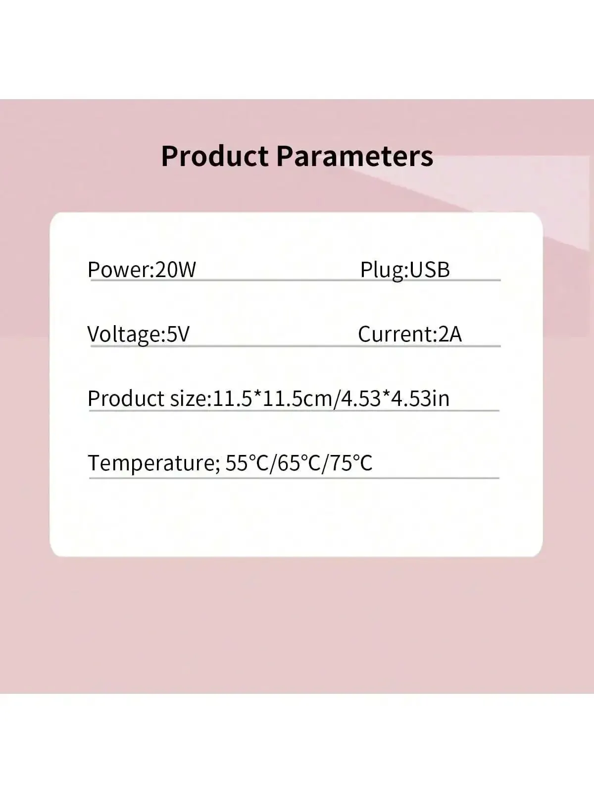 SPECIFICATIONS Brand Name: other Origin: Mainland China Choice: yes Product highlights:1. One start2. Thermostatic black technology3. Meet the needs of different cups4. Energy saving power5. Anti slip and thoughtful design6. Insulation 55-75 ° CFunctional parameters:Power: 20wPlug: USBCurrent 2AProduct size: 11.5*11.5cm/4.53in * 4.53